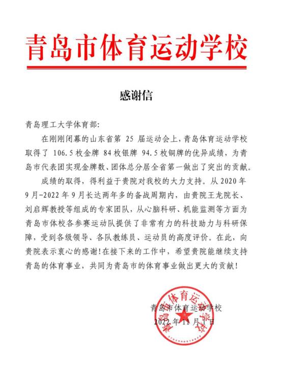 信中表示,在今年举办的山东省第25届运动会上,青岛体育运动学校取得了106.5枚金牌、84枚银牌、94.5枚铜牌的优异成绩,为青岛市代表团实现金牌数、团体总分全省第一做出了突出贡献。这一成绩的取得,得益于yl23455永利集团yl23455永利集团的大力支持。从2020年9月,青岛市体育运动学校“体教融合同频振·高校助力共发展”行动启动以来,在两年多的备战周期内,由王龙主任、刘启辉教授等专家组成的科研团队,从心脑科研、机能监测等方面为青岛市体校各参赛运动队提供了非常有力的科技助力与科研保障,受到各级领导、各队教练员、运动员的高度评价。