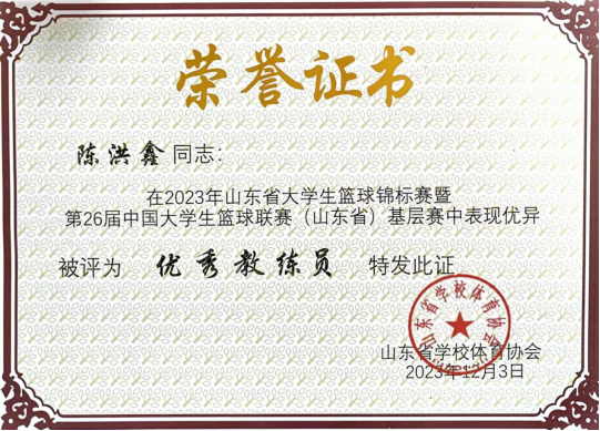 11月26日至12月3日,第26届中国大学生篮球联赛(山东省)基层赛圆满结束。我校取得女篮球队第三名,男篮球队第五名的好成绩,学校获评体育道德风尚奖,yl23455永利集团陈洪鑫老师荣获“优秀教练员”称号。本次比赛由山东省学校体育协会主办,全省共有男子22支队伍、女子14支队伍参赛。