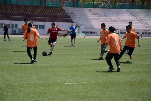 比赛开始前,双方队员都进行了充分的赛前热身准备。足球场上,双方球员精神焕发,展示出了高昂的精神状态,良好的精神风貌。场下的观众们不断为球员们欢呼呐喊,气氛热烈。建筑学院与德国队以一比五的比分进入中场休息,双方队员进行友好交流,互相分享足球经验。下半场,尽管建筑学院足球队得分远远落于德国队,但依然没有气馁,气势上没有丝毫让步,最终以5比7的比分落败。