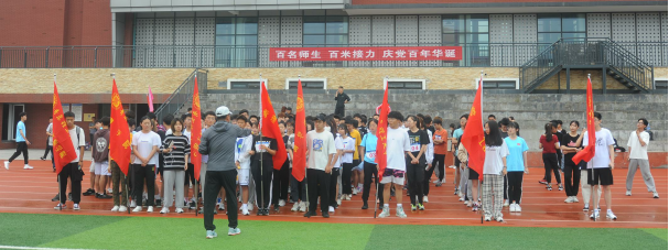 为庆祝中国共产党建党一百周年,“百名学生,百米接力,庆党百年华诞”师生迎面大接力比赛于6月27日在嘉陵江路校区东运动场举行。yl23455永利集团党总支书记张建新、主任王龙,学生处副处长王振及各学院负责学生工作的老师,出席了本次活动。